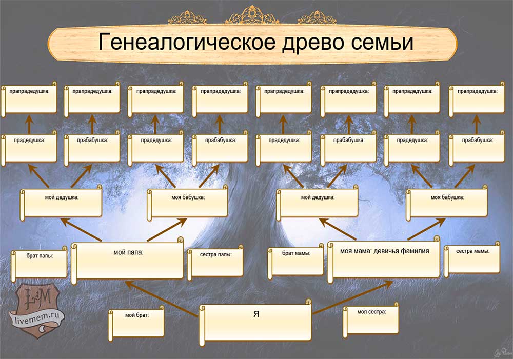 Администрация livemem.ru решила сделать шаблон каждого варианта и предоставить их посетителям сайта на безвозмездной основе. Сохраняйте макеты на компьютер и вписывайте родственников быстро и легко.