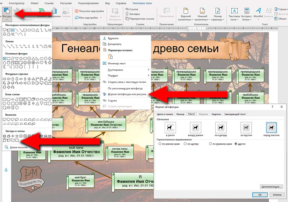 Перейдите в раздел "Формат автофигуры" и далее выберите вкладку "Макет", где указывается нужный режим. Если есть свои подготовленные изображения, можете вставить их, установить правильную настройку относительно текста, и колдовать с продвинутой версией модели. Читателям сайта пригодится наша эксклюзивная раскраска родословного дерева, ее легко распечатать на домашнем принтере. Это еще один бесплатный пример древа от нас.