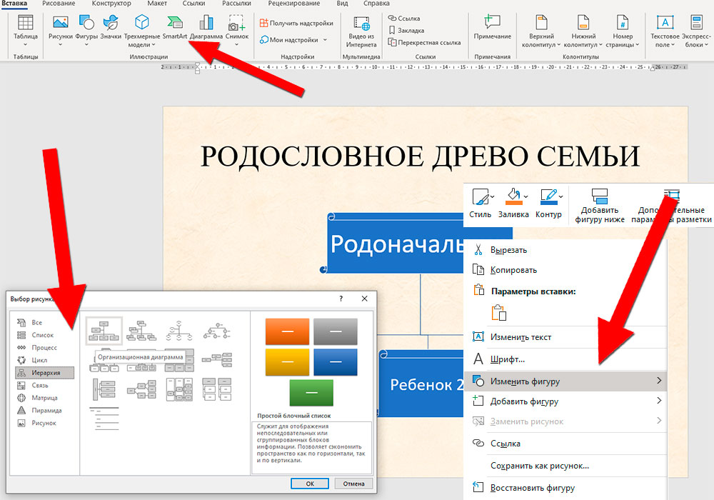 Вариант оформления дерева семьи в Ворде посредством СмартАрт - наиболее комфортный и понятный. Схема появляется в докуметне буквально за несколько шагов. Чтобы воспользоваться этим функционалом пройдите следующий путь: Панель инструментов -> Вставка -> SmartArt -> Иерархия -> Организационная диаграмма. На последнем шаге можно также выбрать блок "Горизонтальная иерархия", посмотрите несколько вариантов и выберите соответствующий задаче. Используя этот метод отрисовки генеалогического древа в Ворде можно менять сопутствующие настройки: